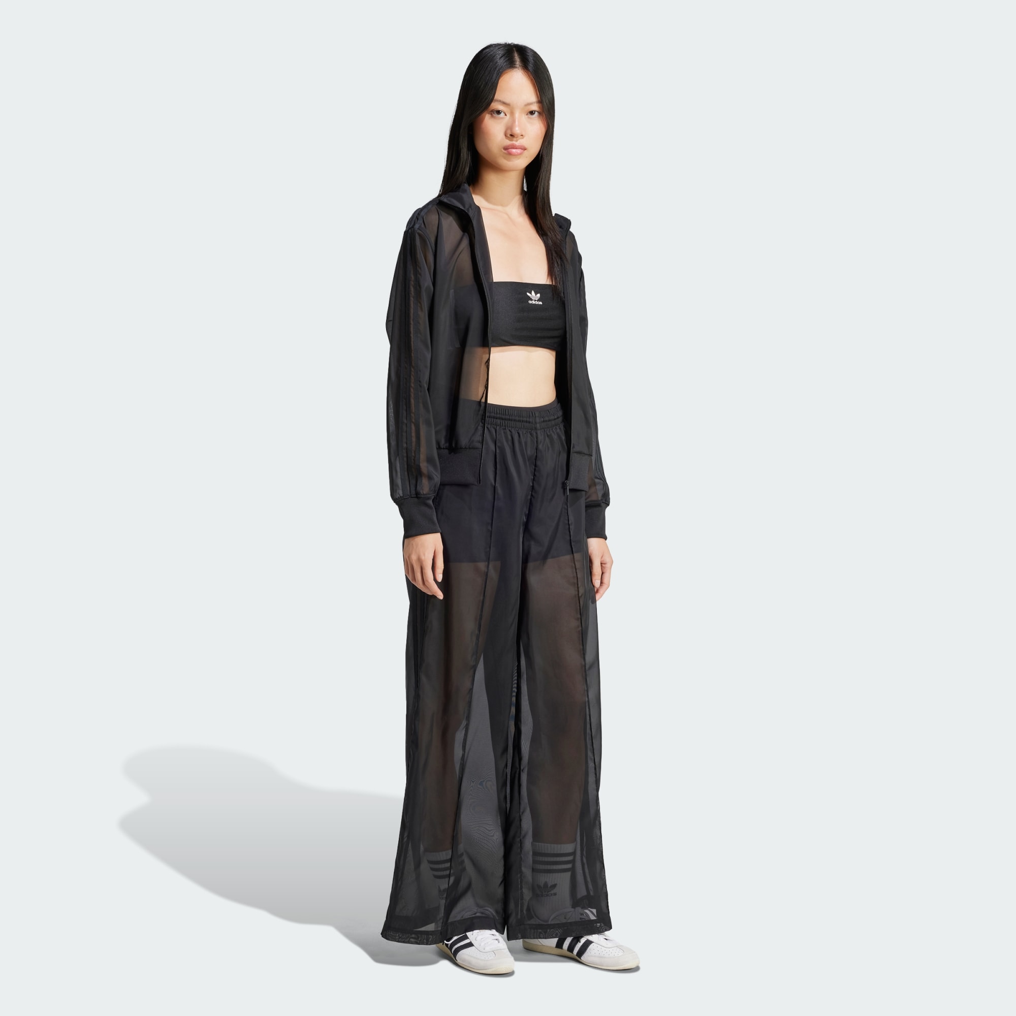 Er gaat niets boven de klassieke uitstraling van een adidas sportjack. Deze op het begin van de 21ste eeuw geïnspireerde versie verhoogt het niveau met doorschijnende stof. Het losvallende, lichtgewicht model is perfect om over een tanktop te dragen voor een avond uit, of over een sportbeha op weg naar de gym.