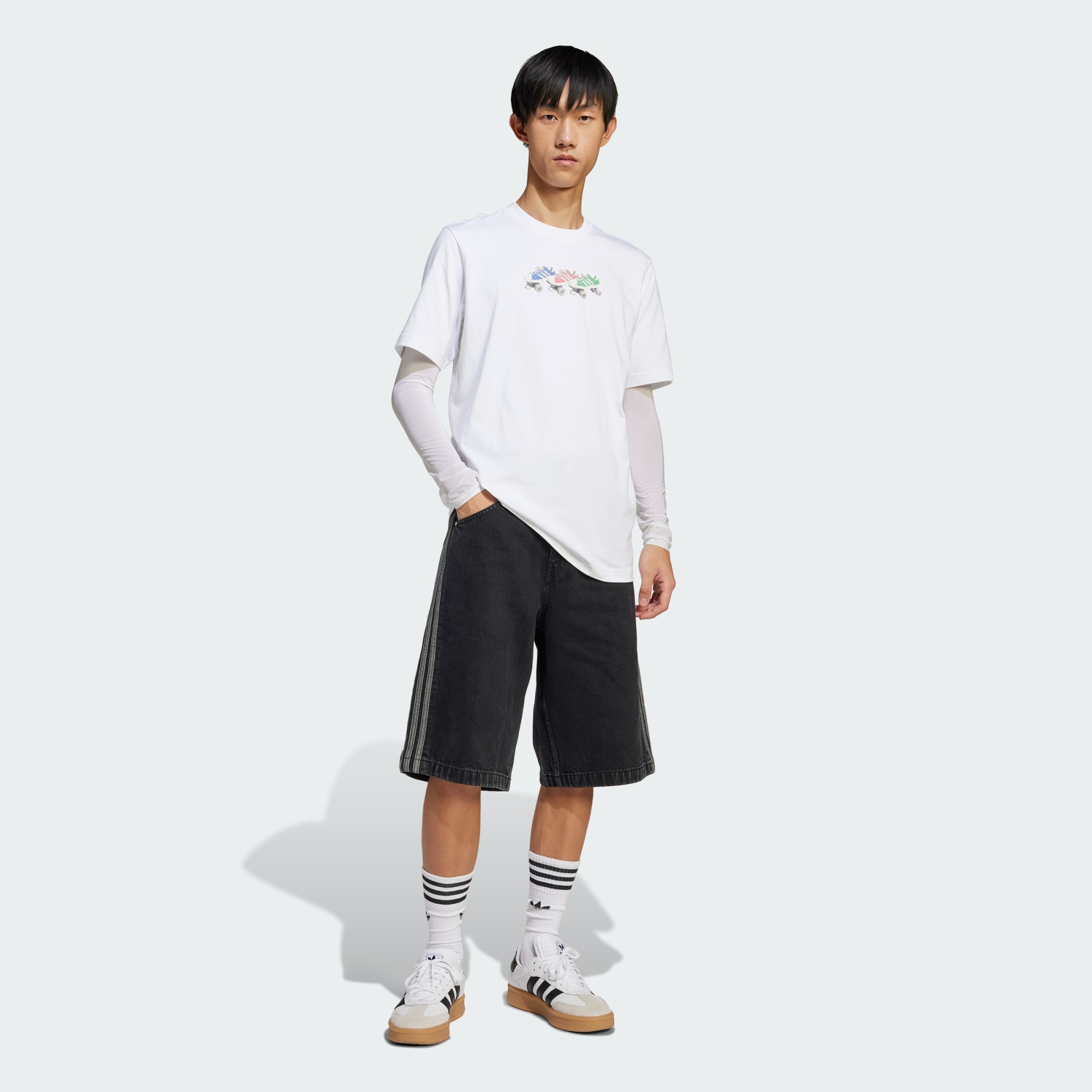 Dit T-shirt brengt een eerbetoon aan de iconische adidas Superstar sneaker met een graphic die 'm opnieuw uitvindt als rolschaatsen. De zachte katoenen jersey biedt de hele dag comfort, of je nu relaxt of onderweg bent.