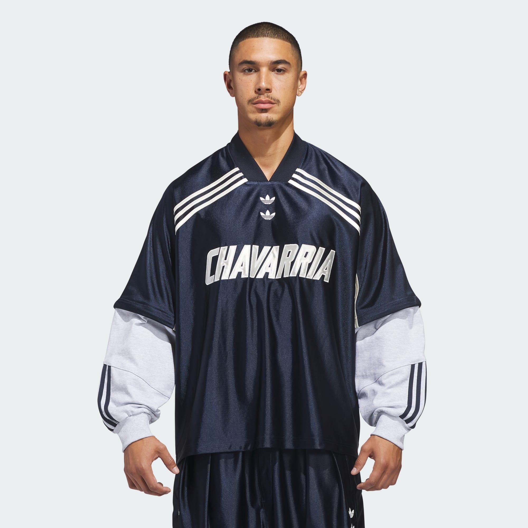 De Chavarria Dazzle longsleeve is uitgevoerd in mix van glanzend dazzle-tricot en dikke katoenen jersey voor uitzonderlijke kwaliteit en comfort. De mouwen en body van het shirt hebben volumineuze proporties. Het is uitgerust met functionele details zoals een ritssluiting halverwege de mouw waarmee het onderste deel kan worden losgeritst, wat resulteert in een shirt met korte mouwen. De kraag rond de V-hals is gemaakt van dikke ribstof. De merken worden gesymboliseerd door geborduurde dubbele Trefoil-logo's midden op de borst, 3-Stripes op het onderste deel van de mouw en op de borst vanaf de hals. Verder prijkt op de voorkant een appliqué van het 'Chavarria'-logo, en achterop onder de kraag is een roos geborduurd.