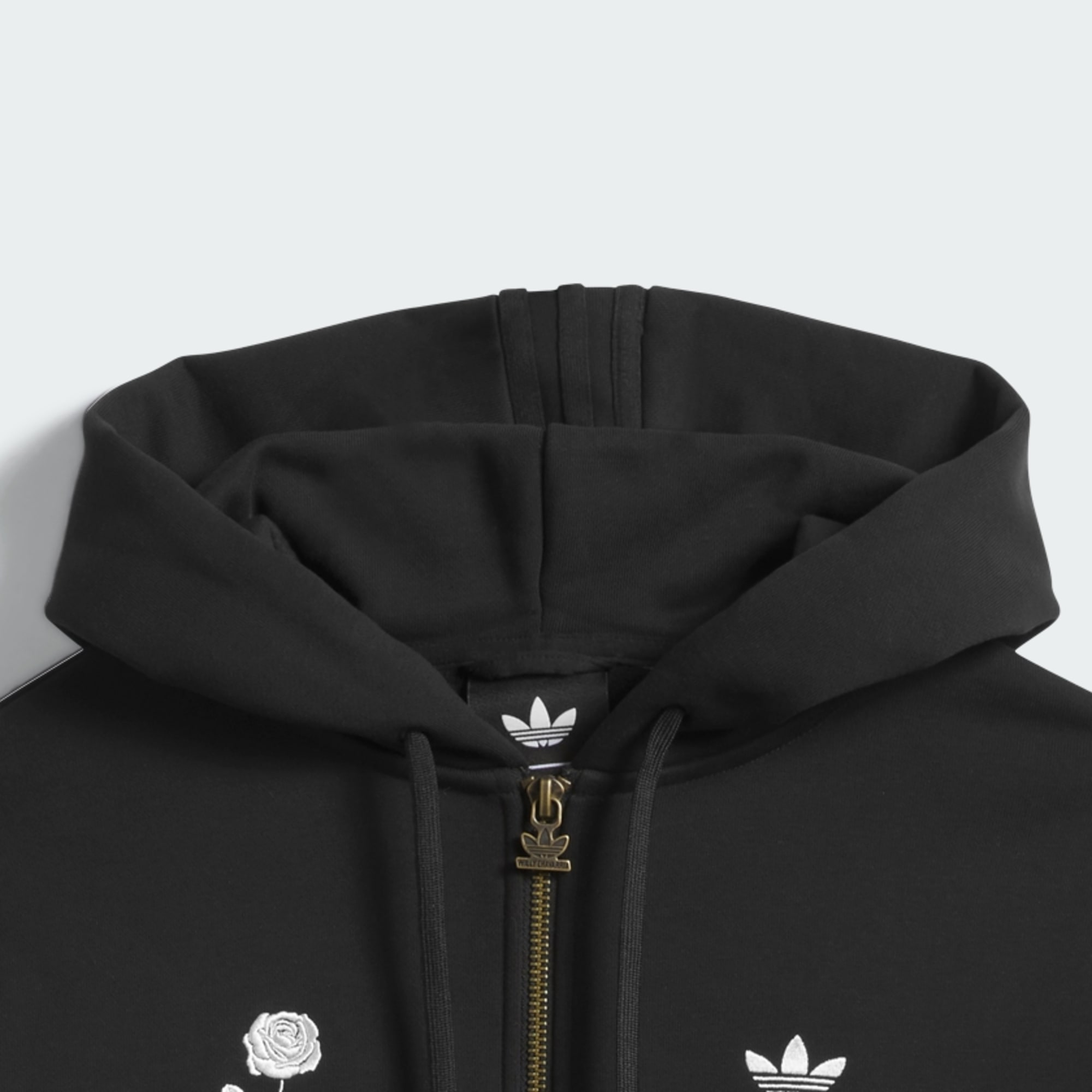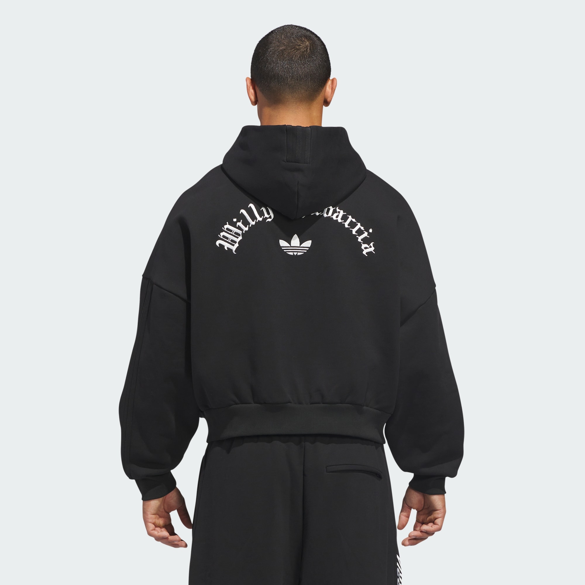 - Gestapelde dubbele geborduurde Trefoils en geborduurd Willy Chavarria en adidas Trefoil op de rug