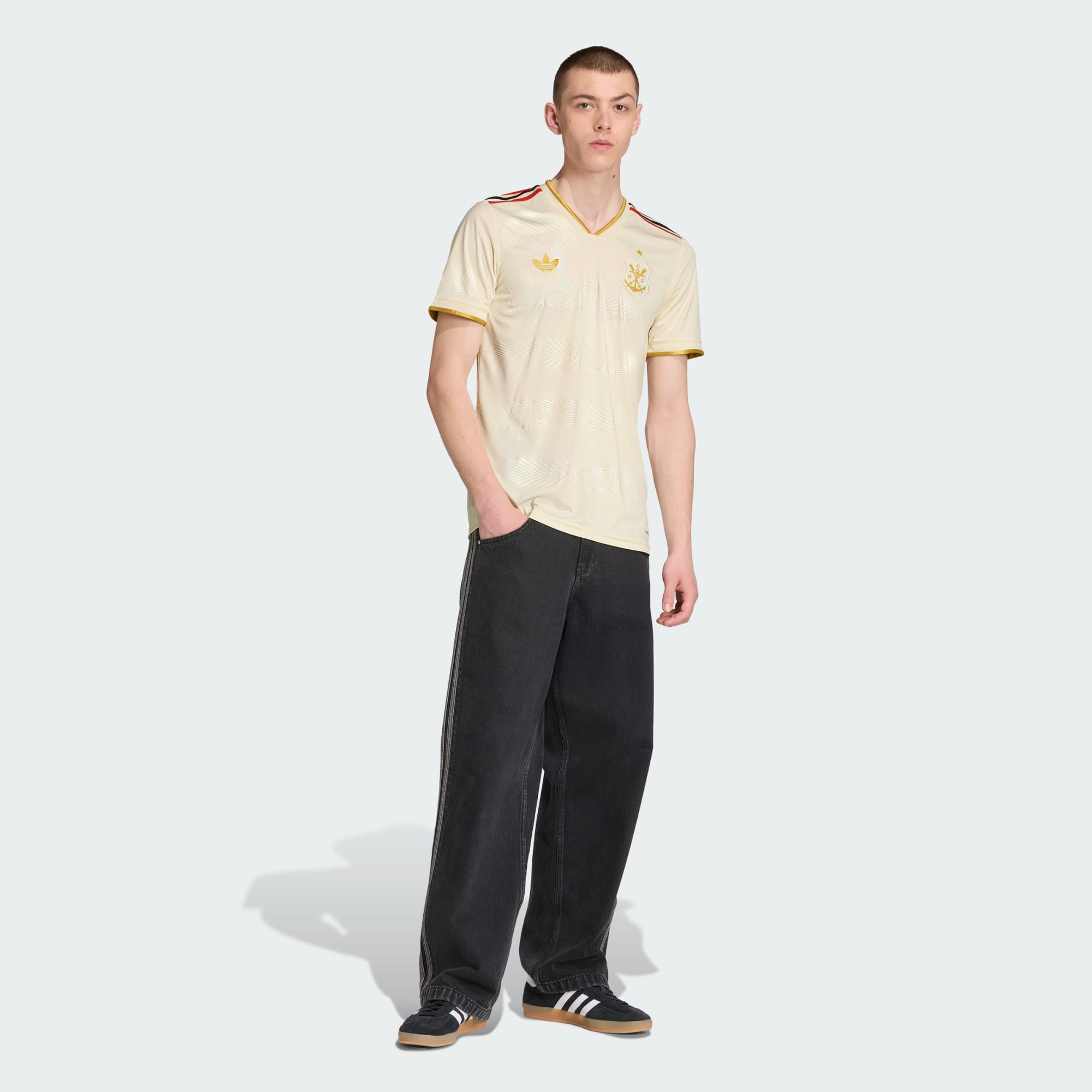 Met 130 jaar sprankelend voetbal in het kielzog van CR Flamengo, eert dit elegante adidas derde voetbalshirt de roei-oorsprong van de club. Het maakt een statement met een vintage embleem, gouden details en subtiele strepen in reliëf op basis van roeispanen. AEROREADY zorgt ervoor dat overmatig vocht tot het verleden behoort voor trouwe supporters.
