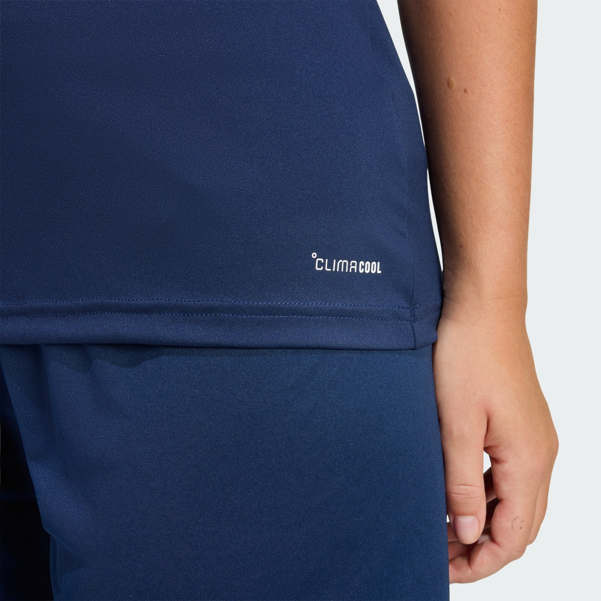 Een voetbalshirt met ronde hals en Climacool-technologie voor droge prestaties zonder afleiding.