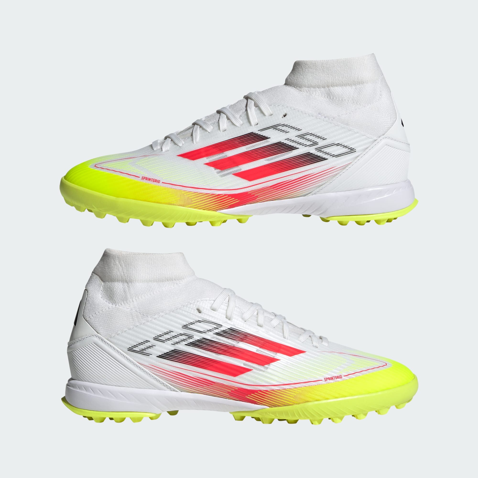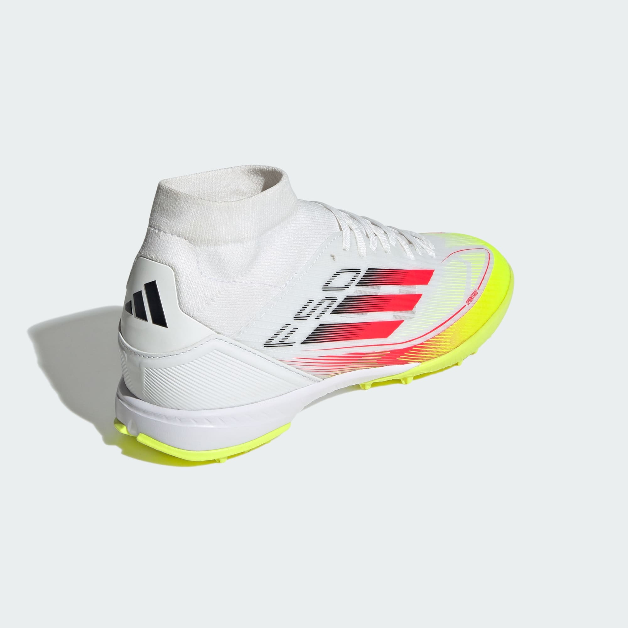 Halfhoge voetbalschoenen voor vlugge voeten op turfvelden, deels gemaakt met gerecycled materiaal.