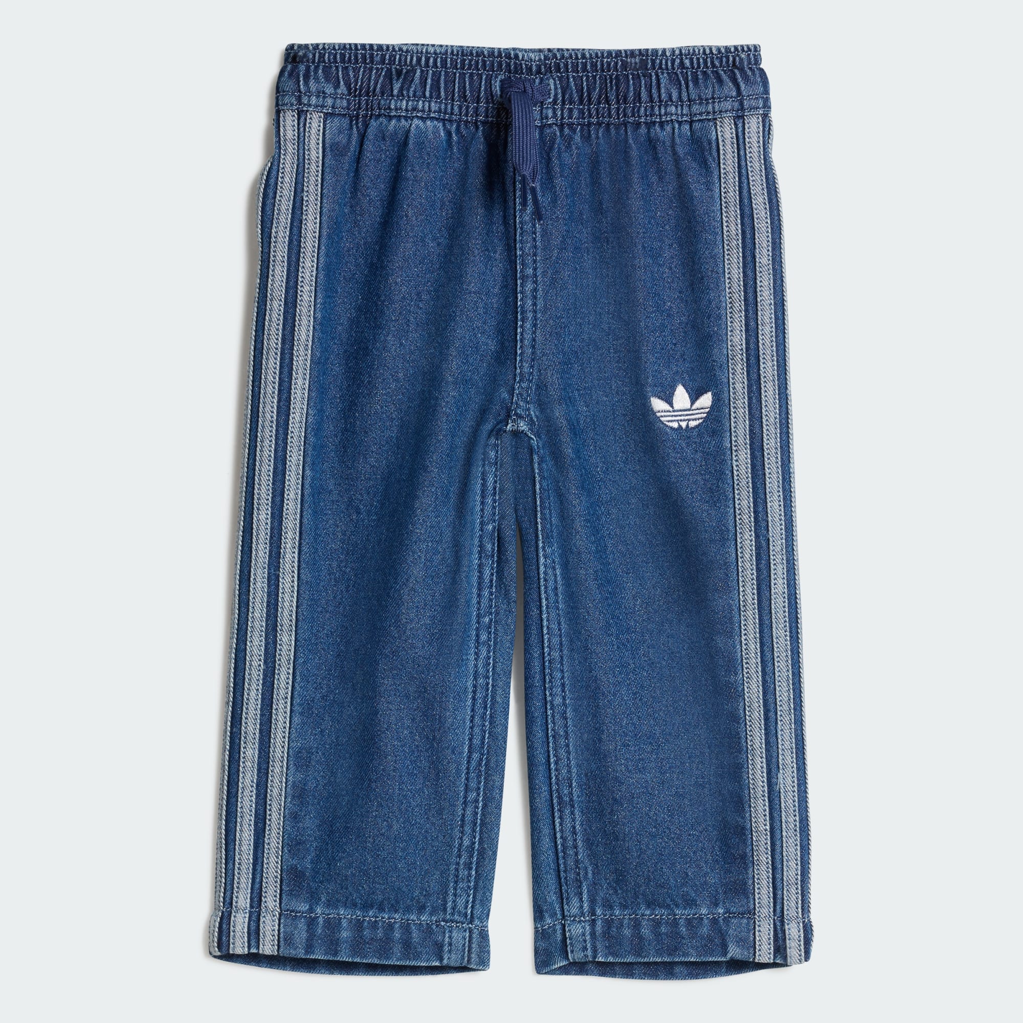 Iconische sportieve stijl met een stoer randje. Deze Firebird Denim trainingsbroek neemt een silhouet dat zijn leven begon in de energieke atmosfeer van de atletiekbaan en geeft het opnieuw vorm in robuust denim. De broek heeft een normale pasvorm voor een comfortabel gevoel en een met een trekkoord verstelbare elastische tailleband voor gemakkelijk aan- en uittrekken. Deze joggingbroek brengt hulde aan z'n sportieve wortels met een geborduurde Trefoil en die iconische 3-Stripes langs de broekspijpen. Maar met z'n denim constructie is hij klaar voor het ruige leven van kleine avonturiers die nog wat wankel op hun beentjes staan.