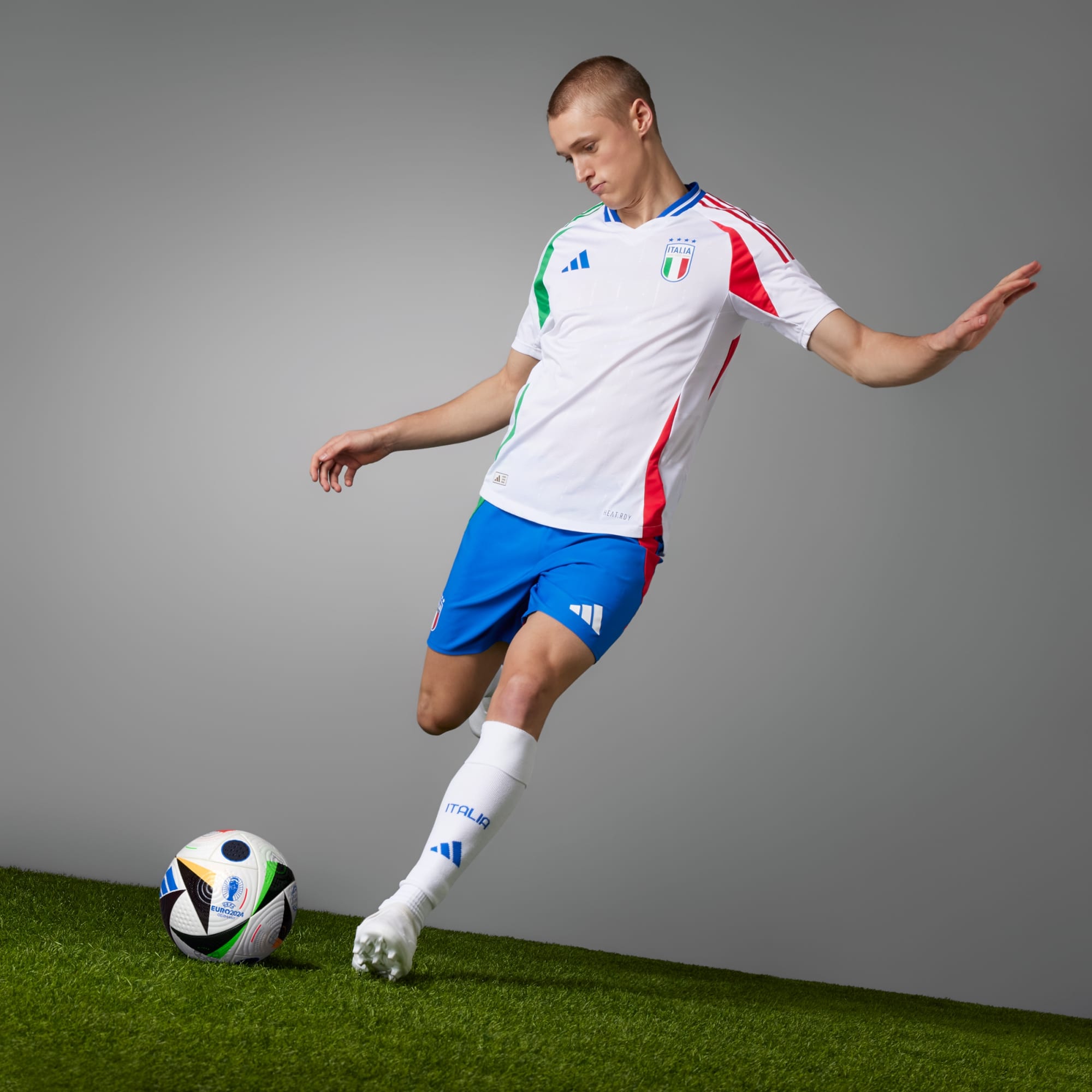 Een officieel voetbalshirt met een Italië-embleem en 3-Stripes.