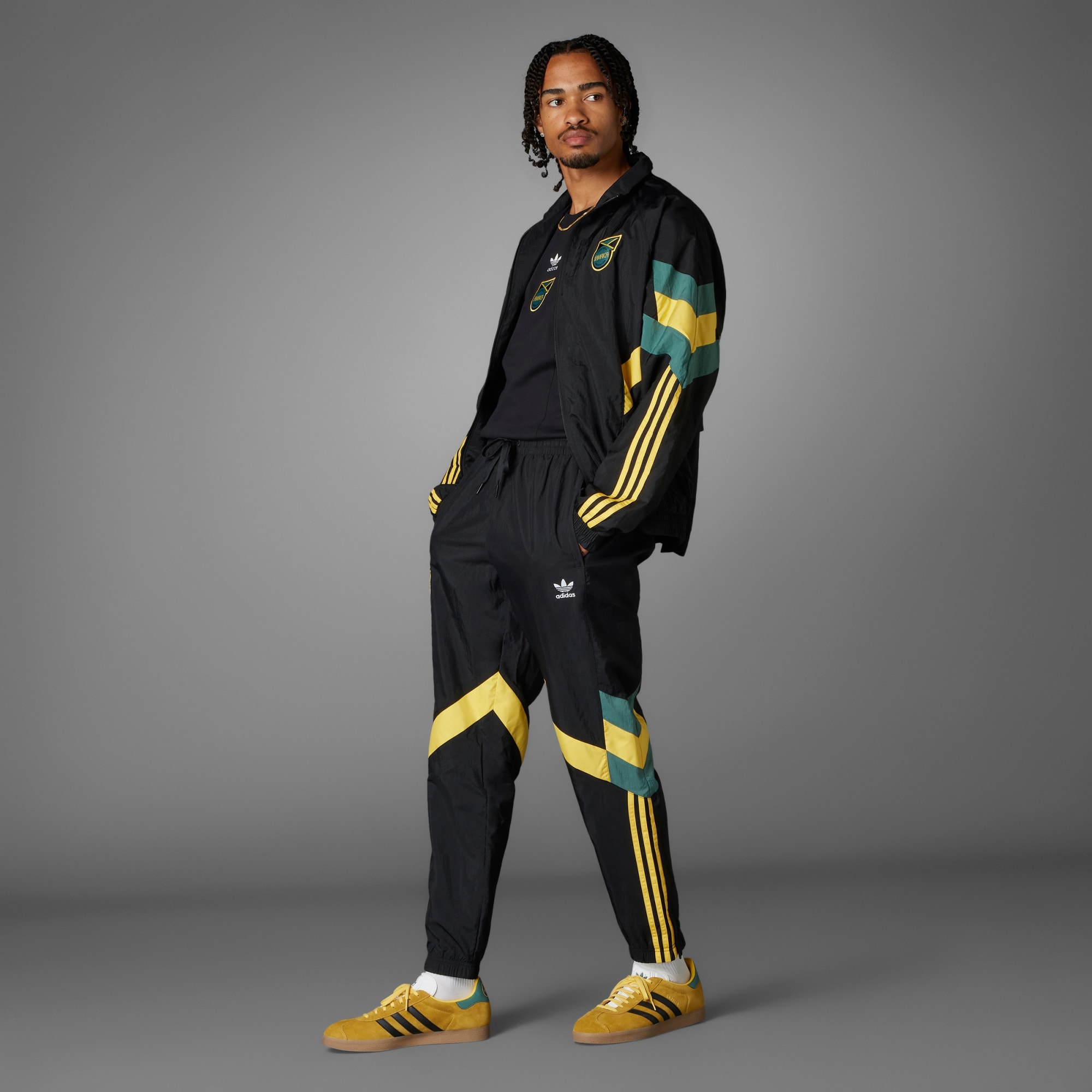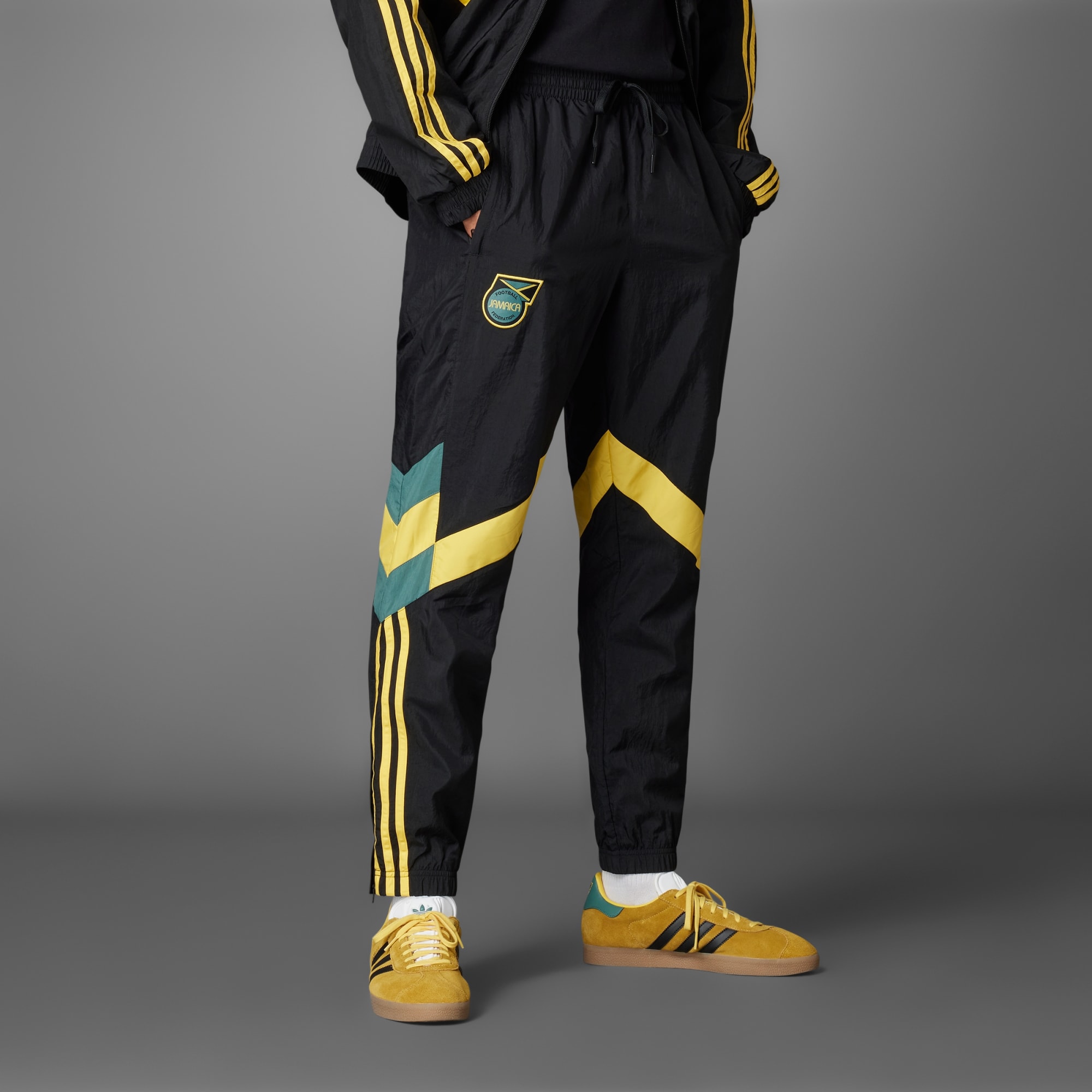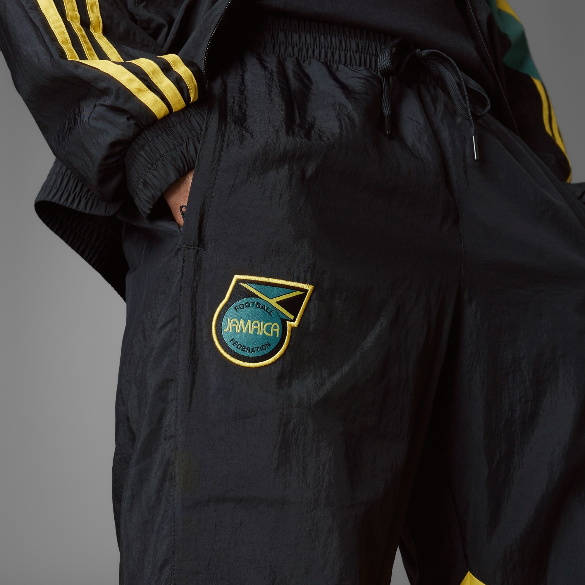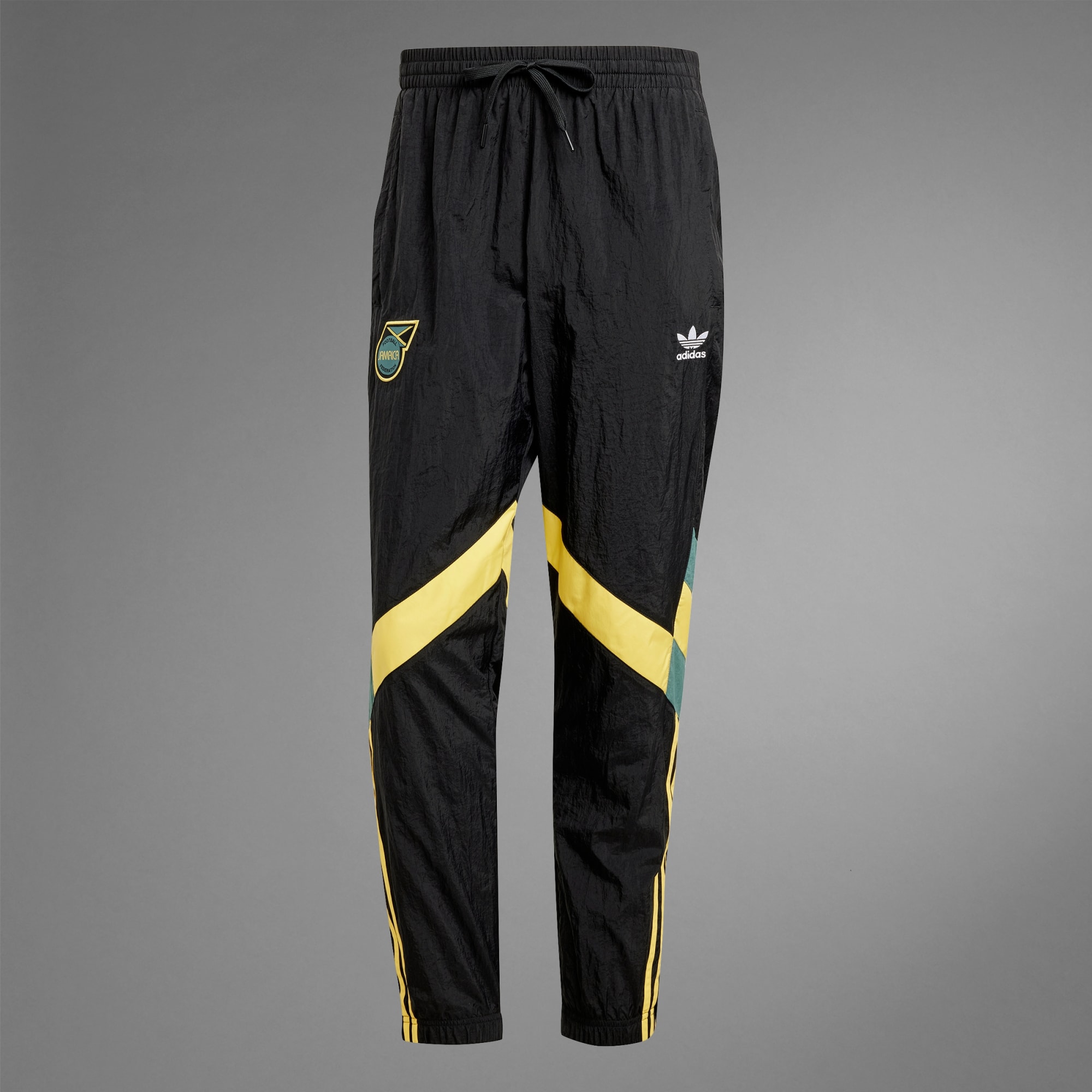 Een Jamaica trainingsbroek met vintage adidas stijl, deels gemaakt met gerecycled materiaal.
