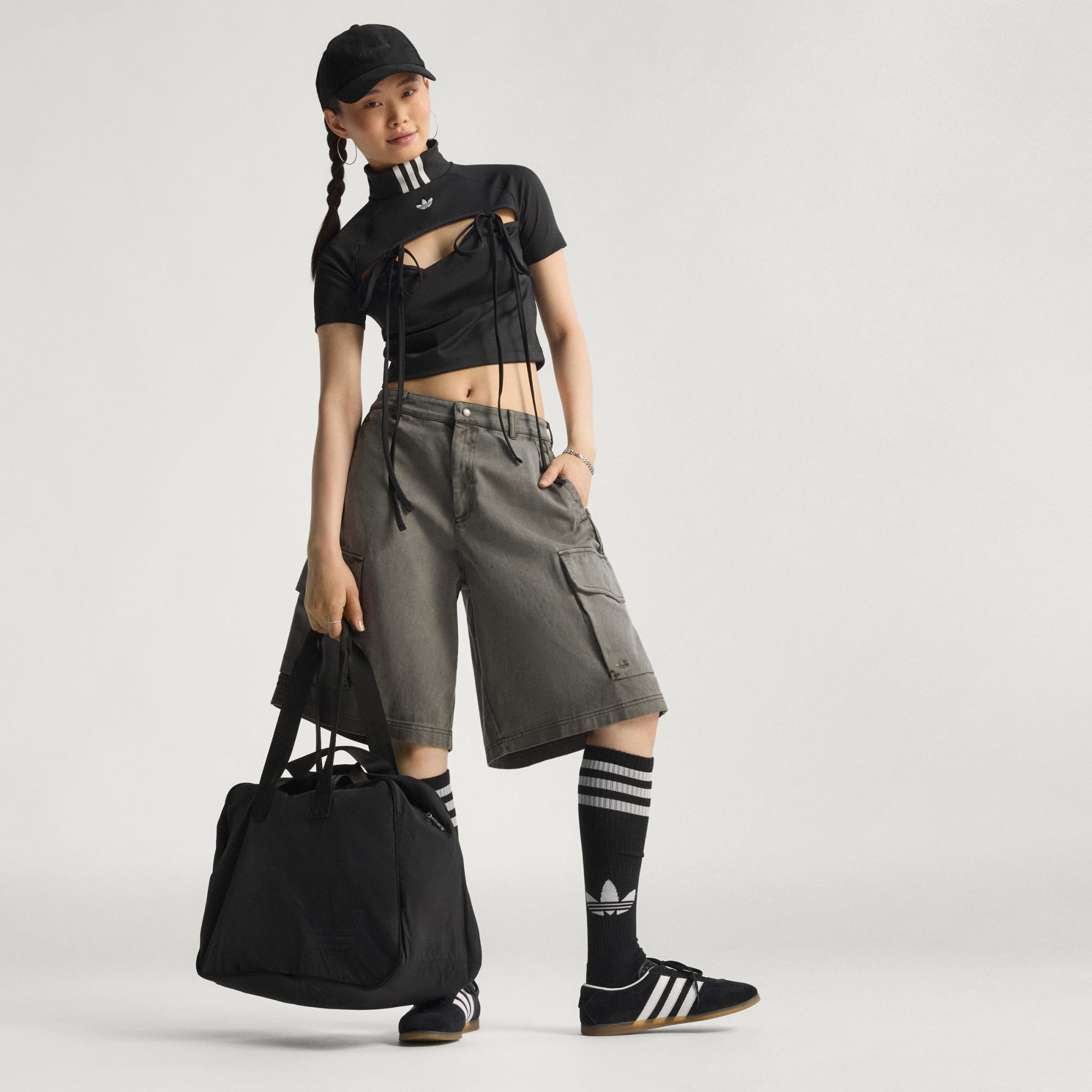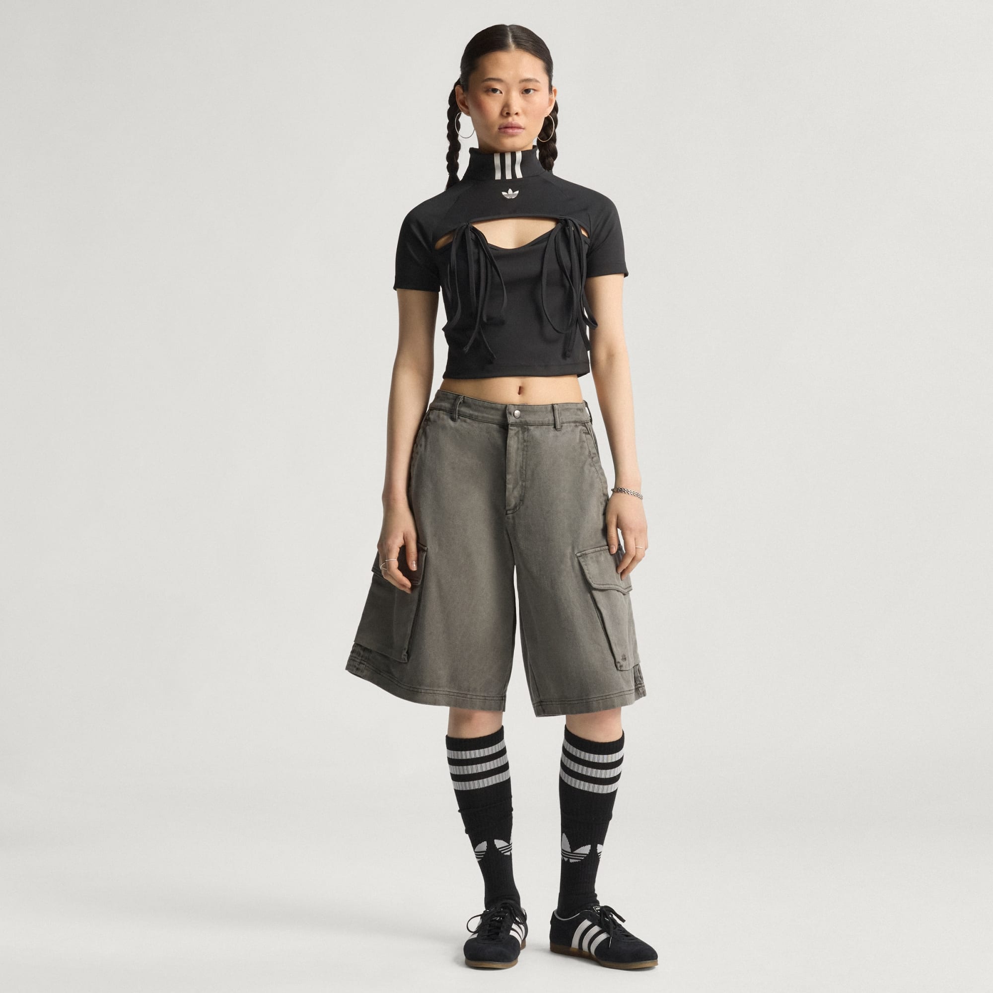 Een croptop met korte col, linten en uitsnijdingen.