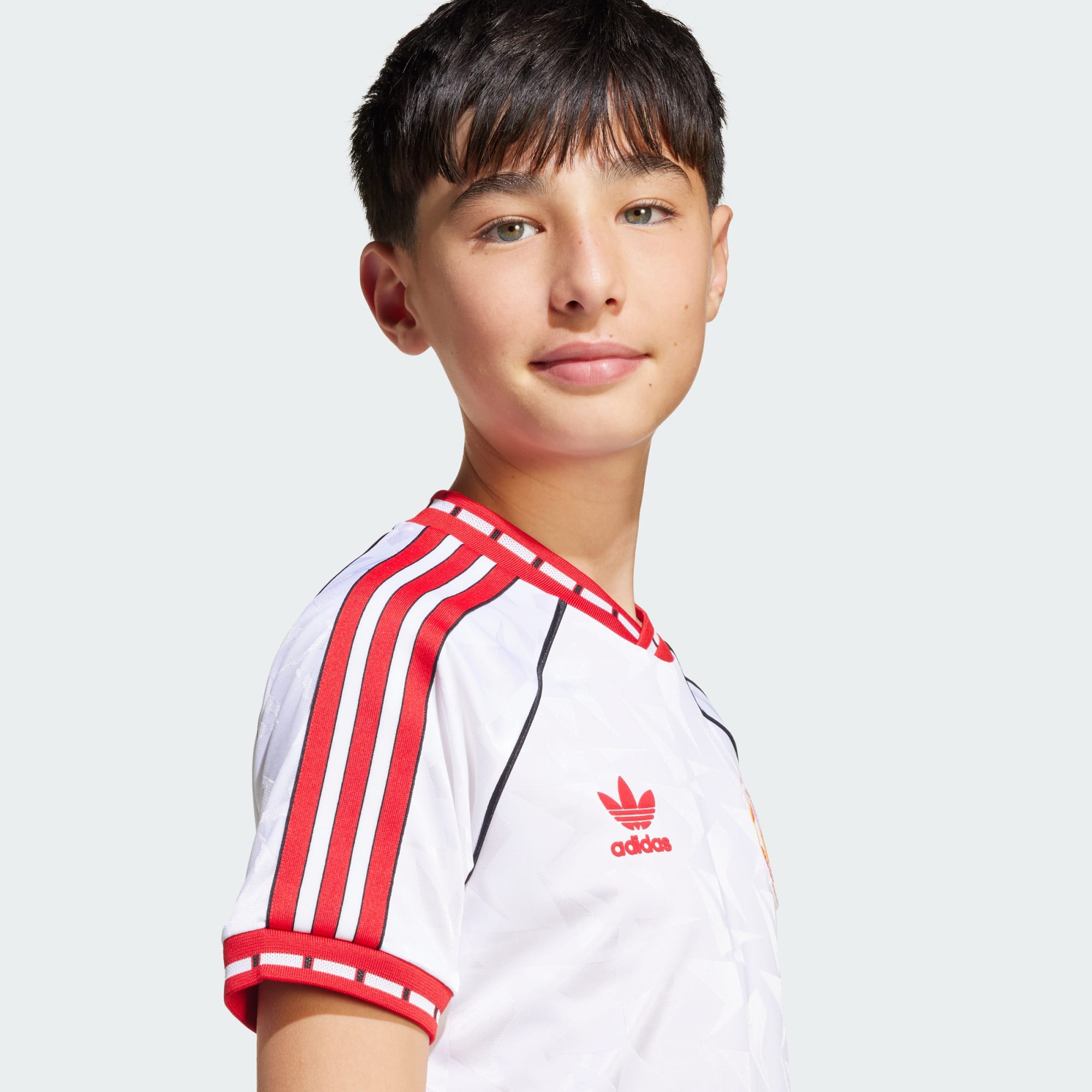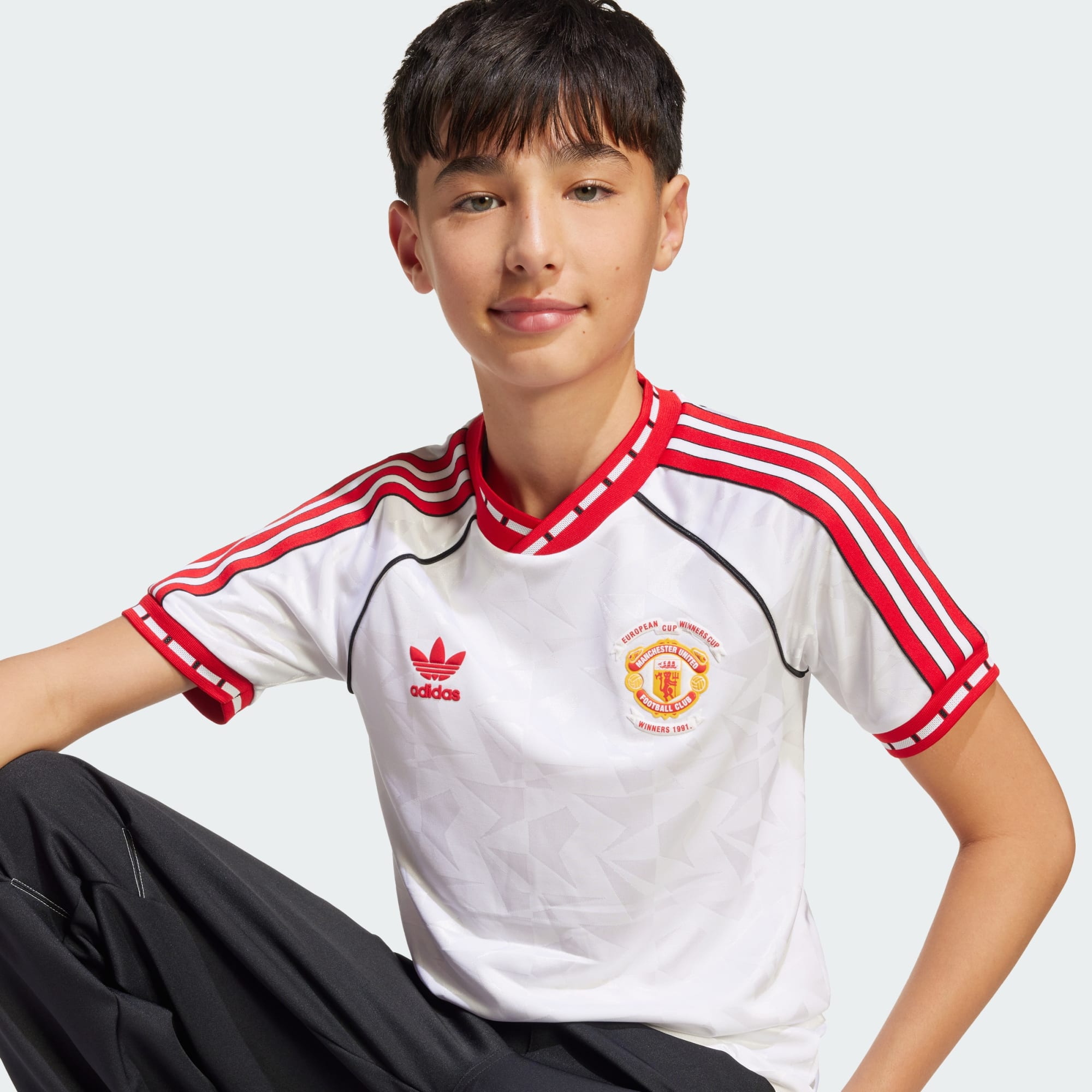 Manchester United won in 1991 het toernooi voor Europese bekerwinnaars, en dit junior voetbalshirt komt uit een collectie ter ere van die speciale triomf. Het is een perfecte remake van het adidas shirt dat de spelers droegen op het veld in Rotterdam, met details op de boorden en kraag en een subtiel patroon aan alle kanten. Een speciale bekerfinale-badge valt op tegen een achtergrond van comfortabel jacquard in het wit van het uittenue.