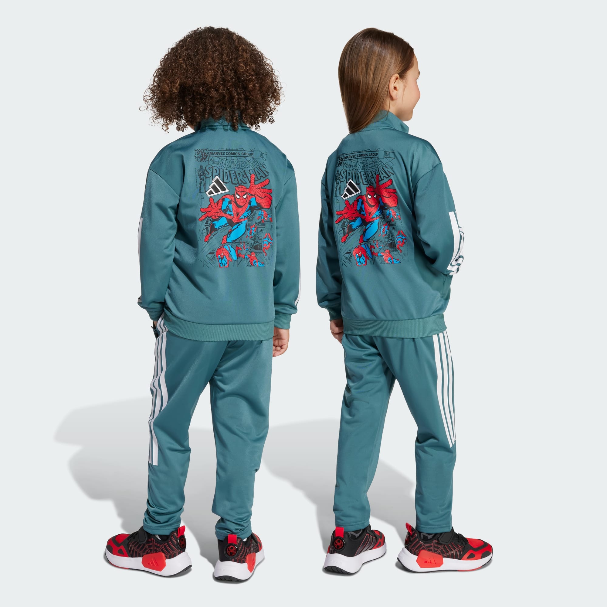 Met dit adidas trainingspak is jouw jonge superheld klaar voor actie. Het is geïnspireerd op Spider-Man en heeft een kleurrijke striptekening op de achterkant van het trainingsjack. De zachte tricotstof en relaxte pasvorm bieden altijd een comfortabel gevoel, of je kids nu door de stad slingeren of gewoon rondrennen in de speeltuin.