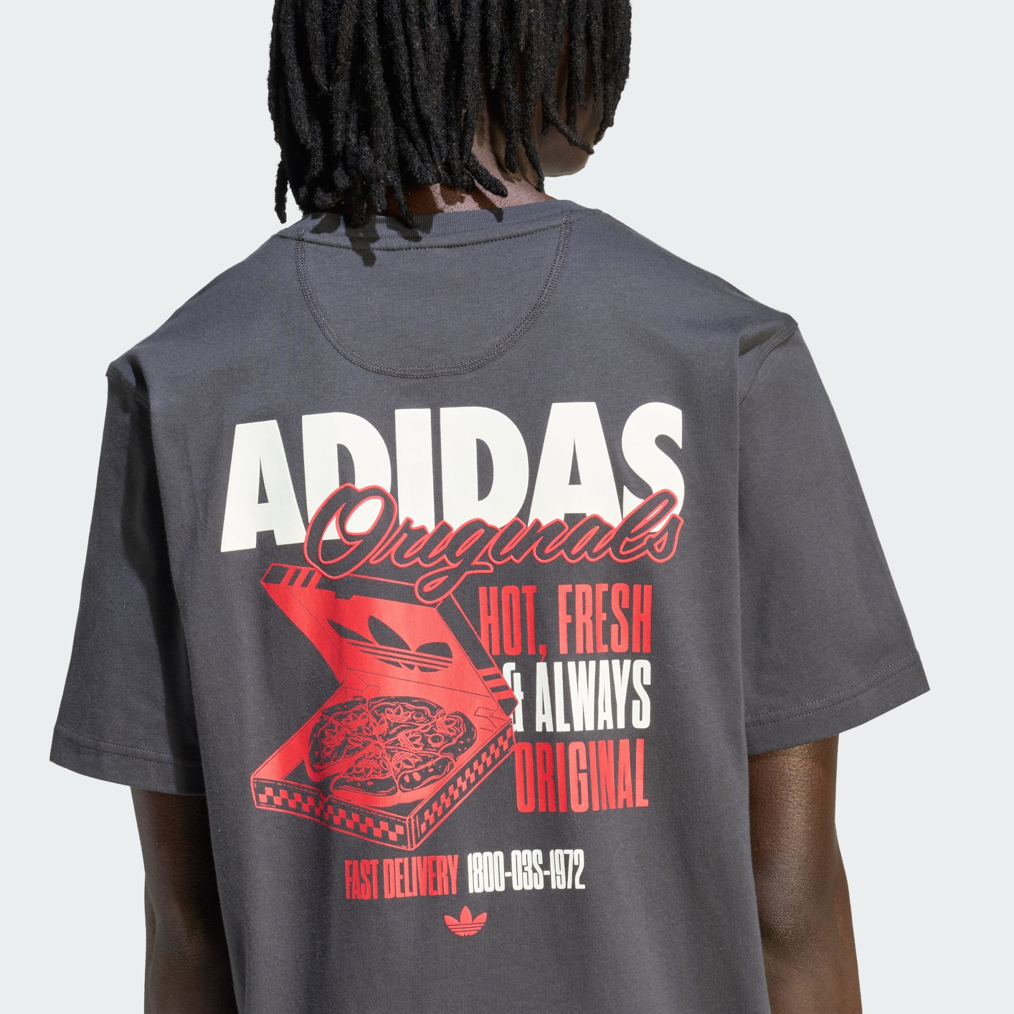 Ontdek het New Pizza Box Graphic T-shirt, een speels kledingstuk dat kenmerkende energie en een vleugje kleur in je garderobe brengt voor een look die onmiskenbaar adidas is. Met een relaxte oversized fit en een constructie van puur katoen biedt het de hele dag door ontspannen comfort met een zacht gevoel. Een relaxte mix die perfect is voor casual wear. De gedurfde graphic op de voorkant maakt de look compleet en zorgt voor een gevoel van plezier en creativiteit, waardoor dit T-shirt jouw go-to wordt voor moeiteloze adidas stijl die jouw persoonlijkheid onderstreept.