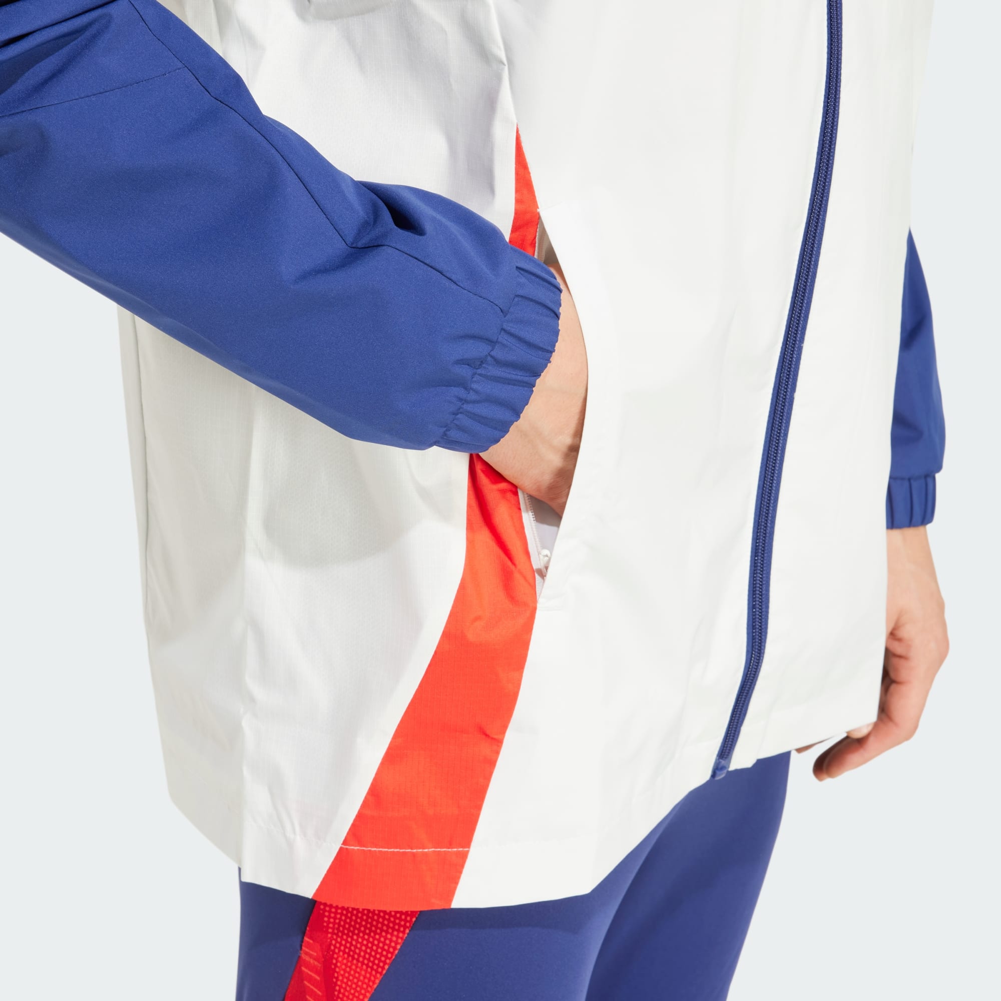 De spelers van Olympique Lyonnais trainen net zo hard als ze spelen. Dus als het weer omslaat, trekken ze een adidas voetbaljack zoals dit exemplaar aan. De waterafstotende stof beschermt je tegen lichte regen, zodat jij kunt focussen op het perfectioneren van je techniek. De opbergbare capuchon is op te vouwen wanneer je 'm niet meer nodig hebt, zodat je onderweg je bedekking kunt aanpassen. Dit product is gemaakt met ten minste 70% aan gerecyclede materialen. Door hergebruik van materialen die al eerder zijn gecreëerd, helpen we afval verminderen, en ook onze afhankelijkheid van beperkt beschikbare grondstoffen. Daarnaast verkleint het de voetafdruk van onze producten.