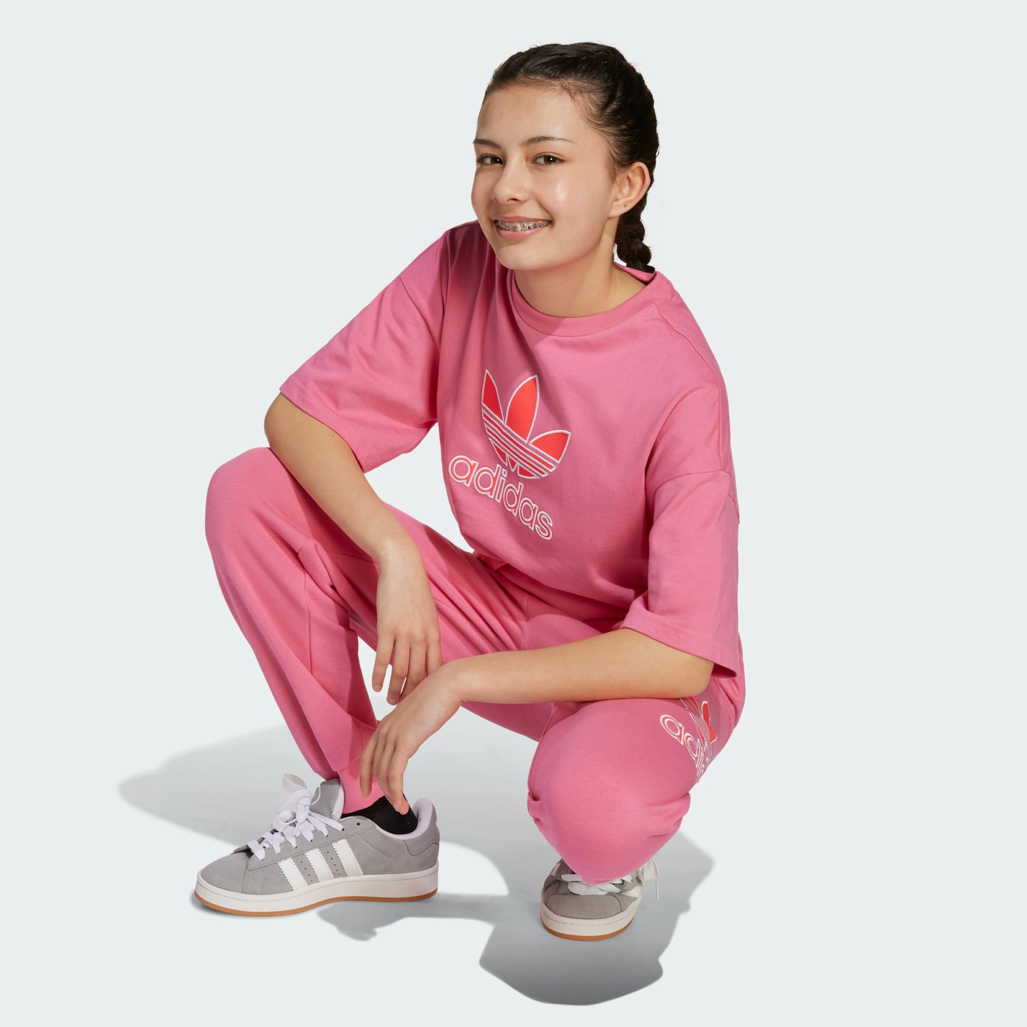 Een losvallend junior T-shirt met een opvallende Trefoil-graphic.