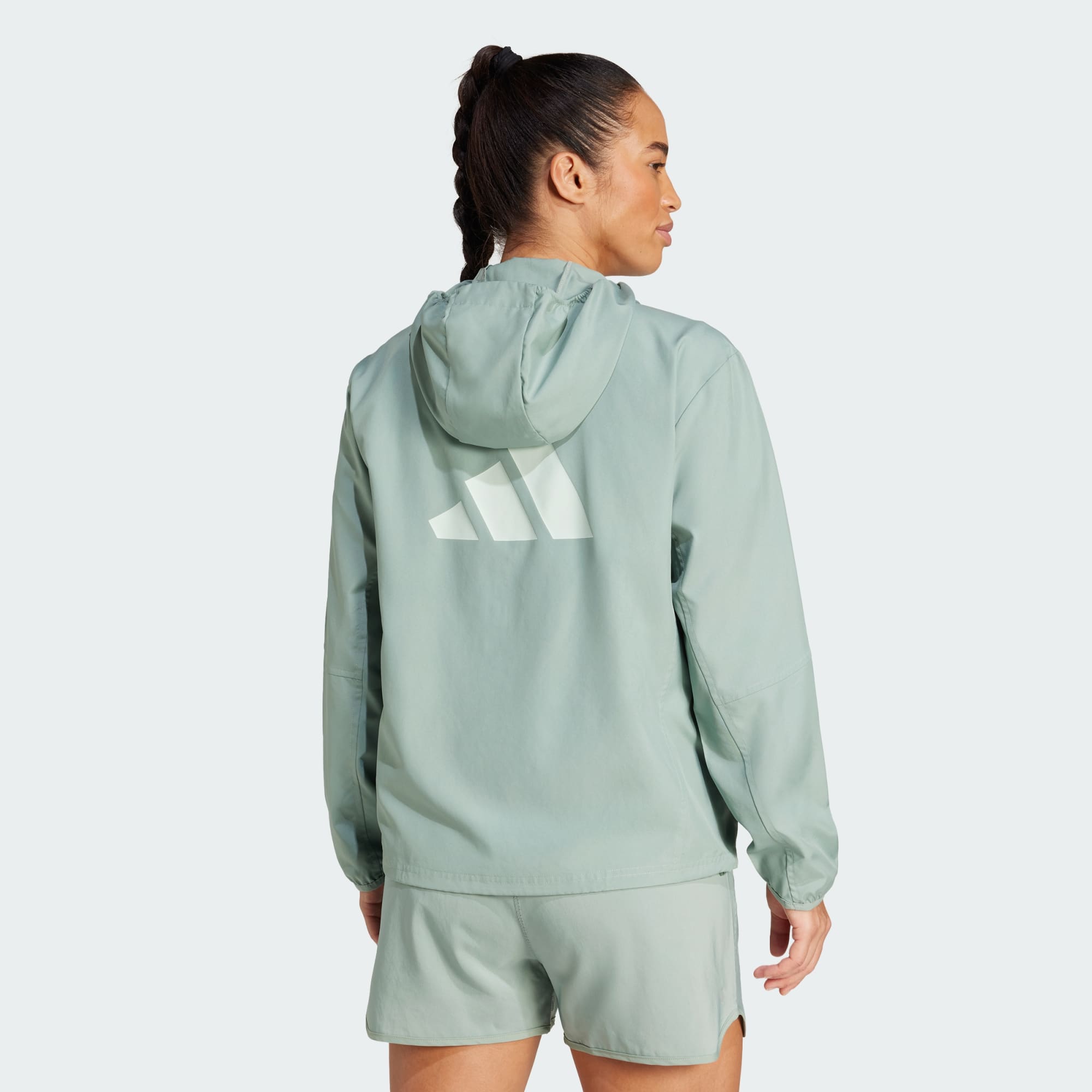 Een hardloopjack met verstelbare capuchon, deels gemaakt met gerecycled materiaal.