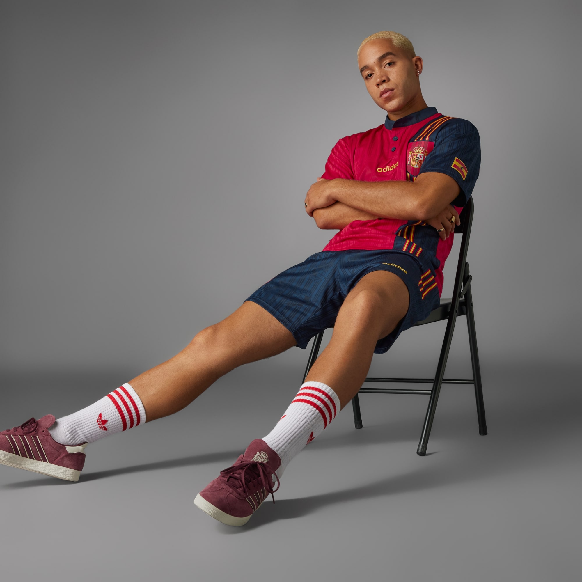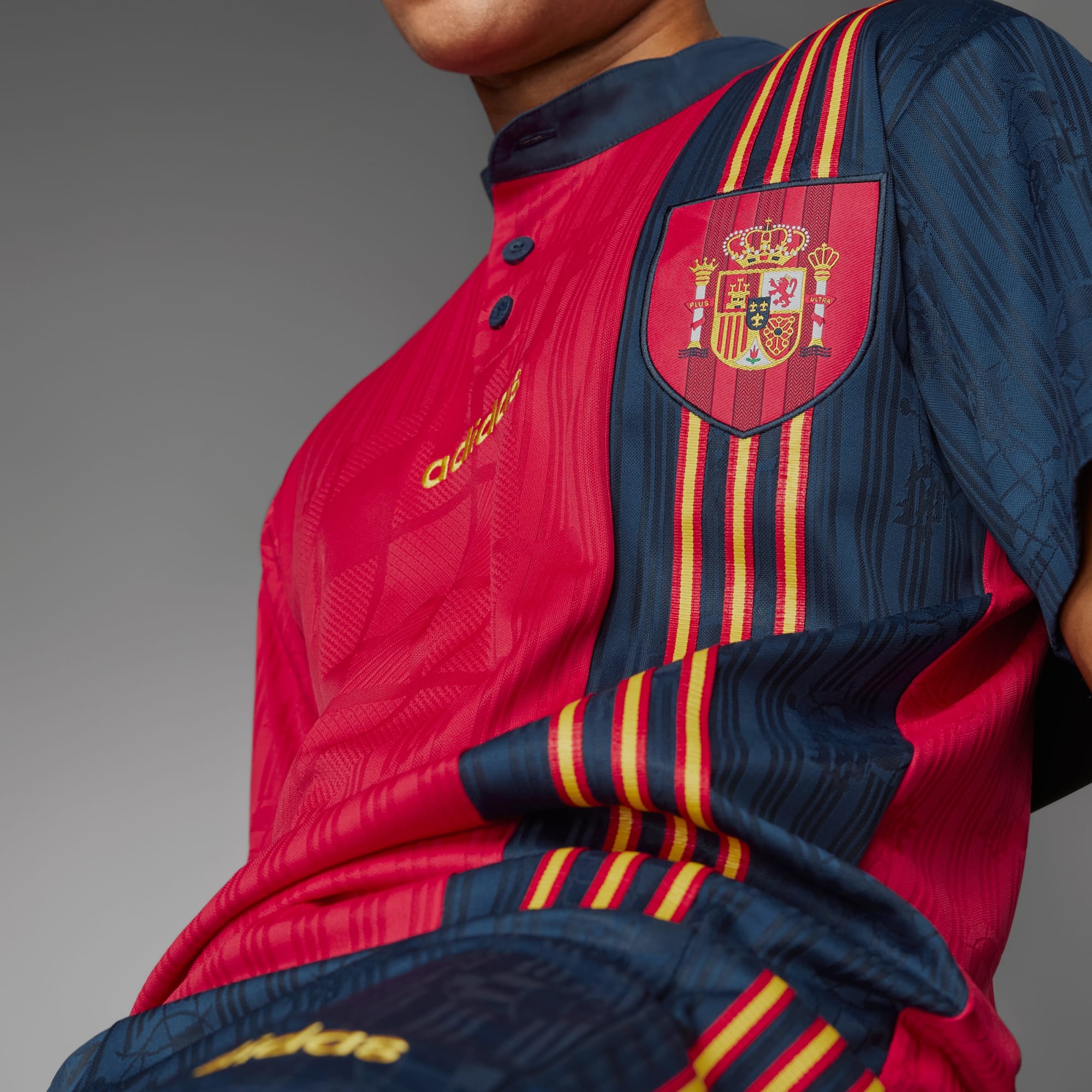 Een gouwe ouwe. Maak een statement met een iconische look die het voetbal van de jaren 90 tekende. Het legendarische thuisshirt van 'la Roja' uit 1996 is terug, zowel voor voetbalfans als voor liefhebbers van retro stijl. Het Spanje 1996 thuisshirt met korte mouwen laat met een tijdloze look zien hoeveel je van historisch voetbal houdt. Het losvallende model dat zo typisch is voor dat tijdperk, plus het adidas lijnlogo en de geweven Spaanse vlaggen op de mouwen geven 't een authentieke 90s-vibe. De opgenaaide Spanje-badge boven de zoom is het detail dat deze retro voetbal-look compleet maakt. Door voor gerecycled materiaal te kiezen, kunnen we materialen hergebruiken die al zijn gemaakt. Dit helpt zowel afval als onze afhankelijkheid van beperkt beschikbare grondstoffen te verminderen.