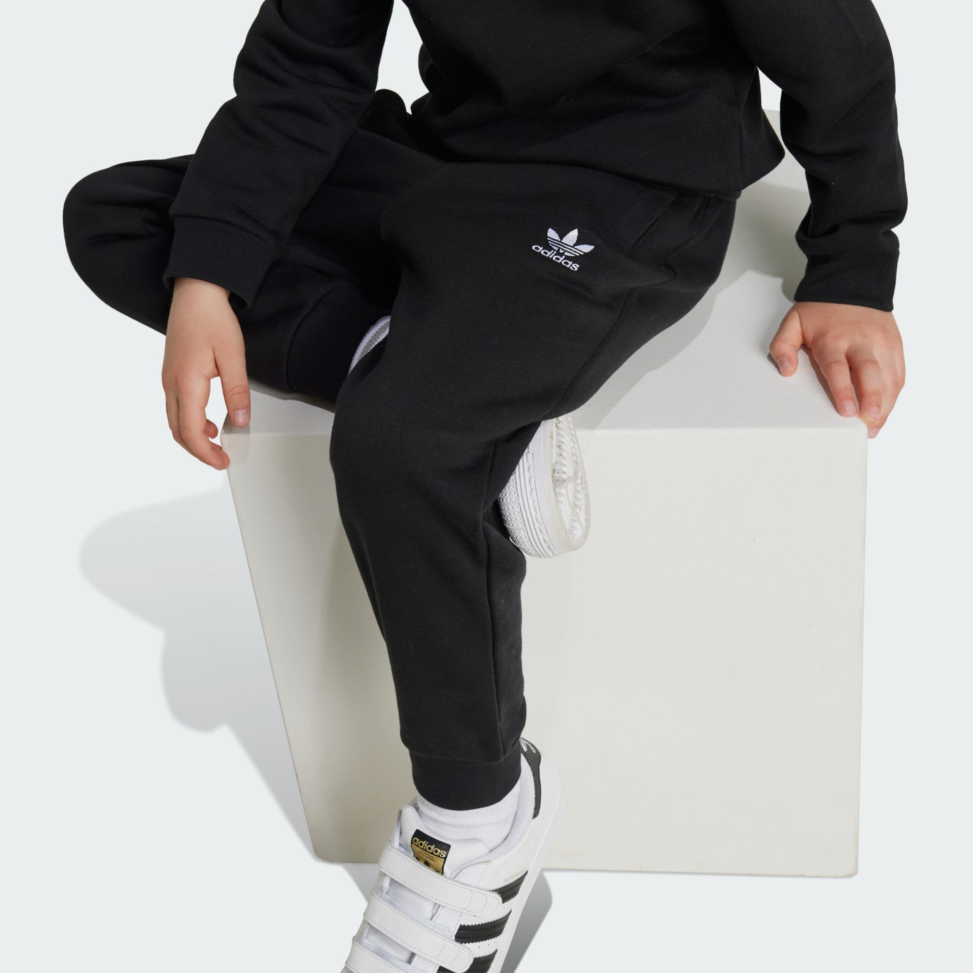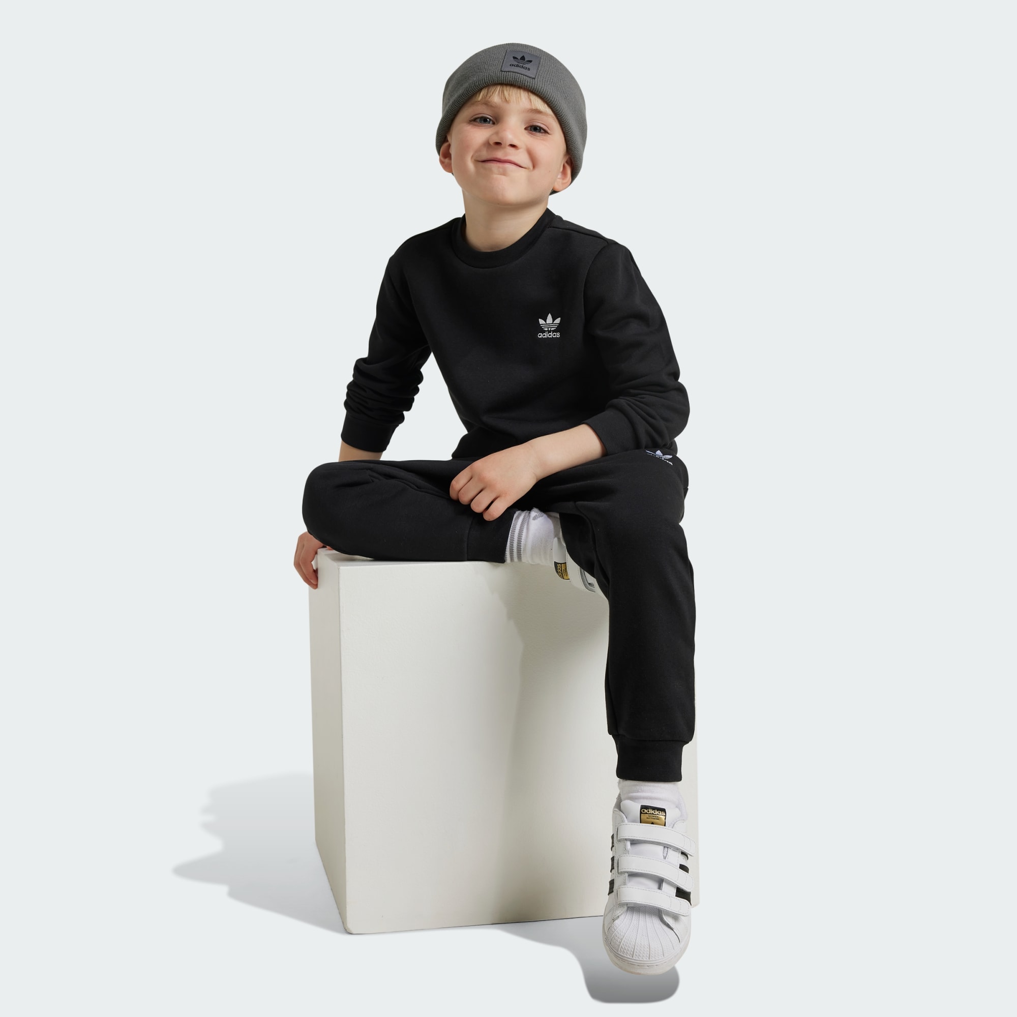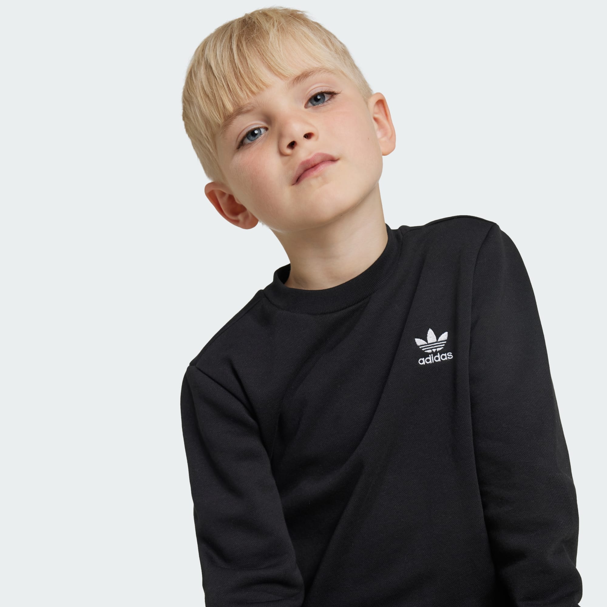 Moeiteloos comfort voor jonge adidas fans. Dit kindersetje wikkelt hen van top tot teen in zachte fleece en heeft ribbels op de kraag, zoom en boorden voor extra behaaglijkheid. De contrasterende Trefoil-logo's op het sweatshirt en de broek verwijzen naar adidas historie om een nieuwe generatie te verbinden met een legacy van sport en stijl. Het katoen in dit product is verkregen via Better Cotton. Better Cotton wordt ingekocht via een handelsketenmodel genaamd massabalans. Dit betekent dat Better Cotton niet fysiek te herleiden is tot eindproducten. Meer informatie vind je hier: https://bettercotton.org/who-we-are/our-logo/