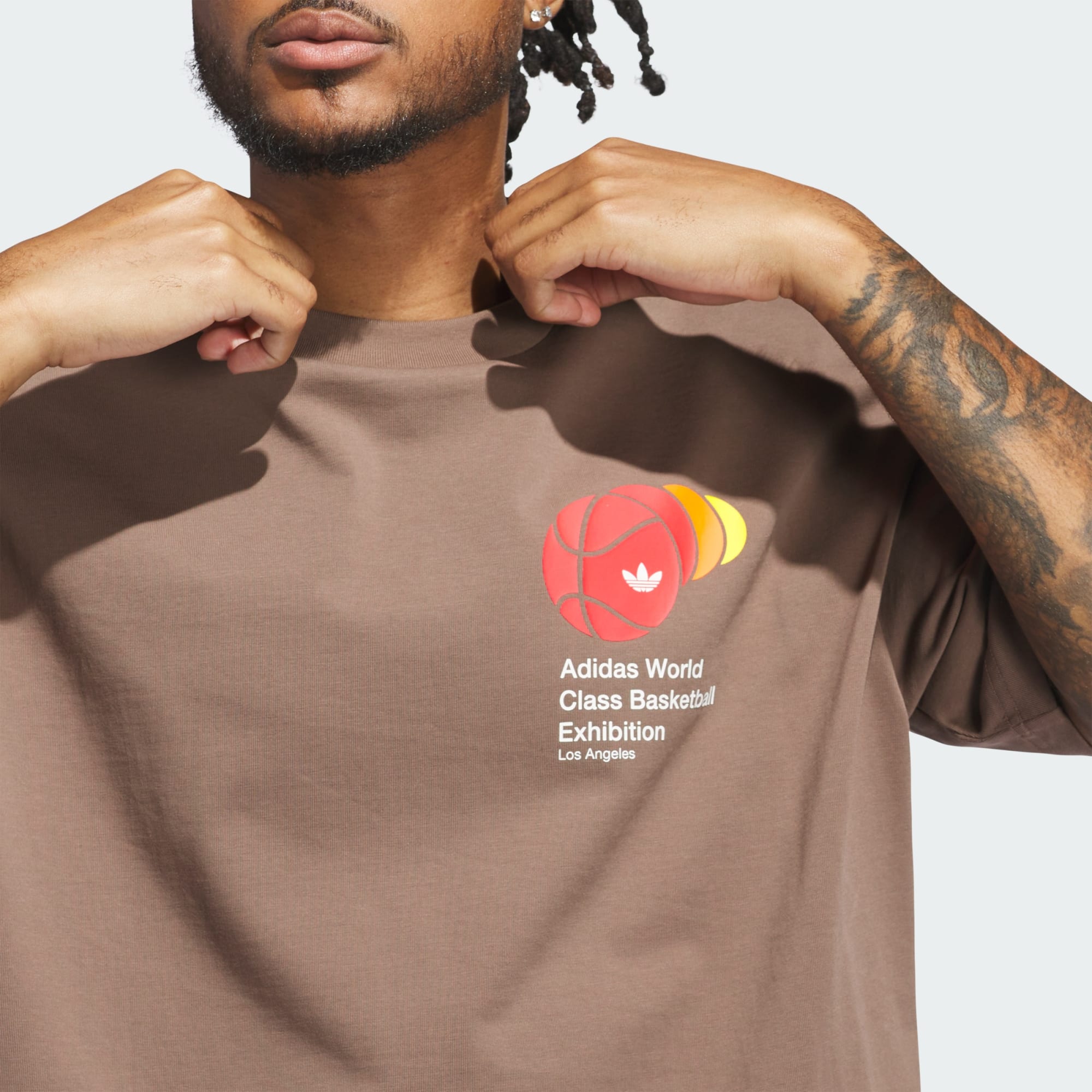 Een losvallend T-shirt met ronde hals en basketbal-graphics.